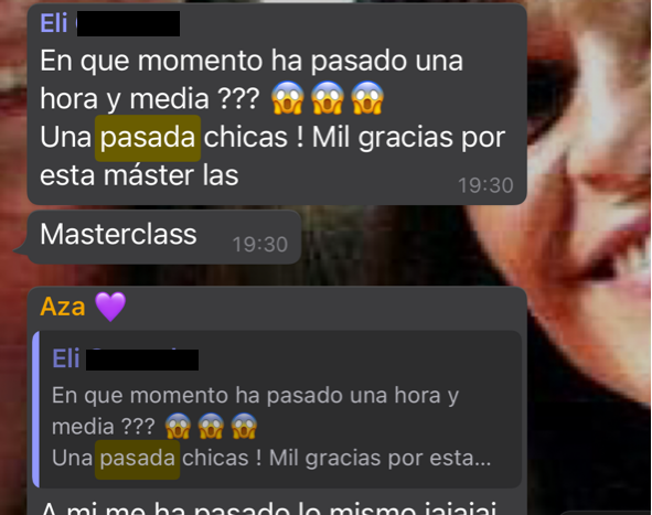 «Me hizo una intervención la cual ha supuesto un antes y después para mi… Tenia ya de hace una semanas atrás un bloqueo bastante importante que me venía por temas personales… Fue brutal, me hizo ver lo que me estaba bloqueando, sacarlo y comprenderlo…»
